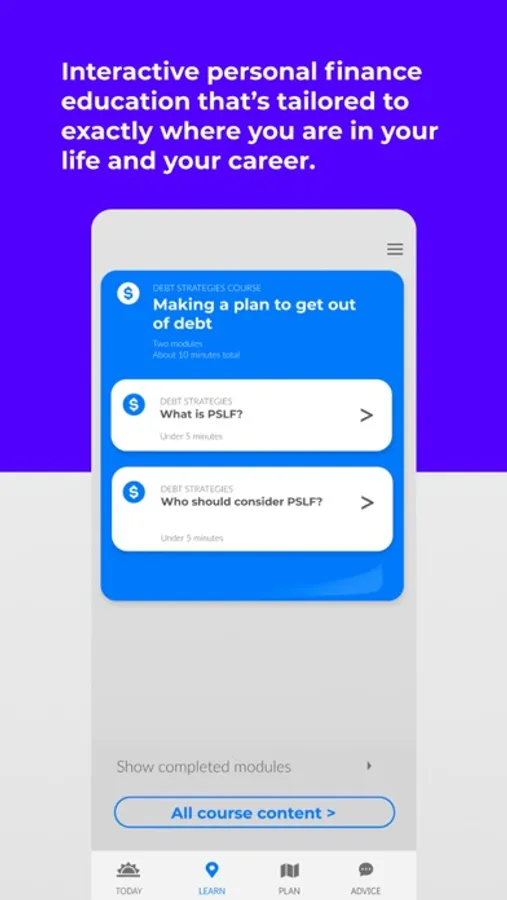 Educate. Do you know if you’re a good candidate for PSLF? Did you get ripped off in your salary negotiations for your first job out of residency? How do you know when it’s time to start investing? How do you even start investing? Answer some basic intro questions about yourself, then head to the Learn screen to watch or read quick modules (most are under 5 minutes) that our algorithm selects for your career stage and life stage.