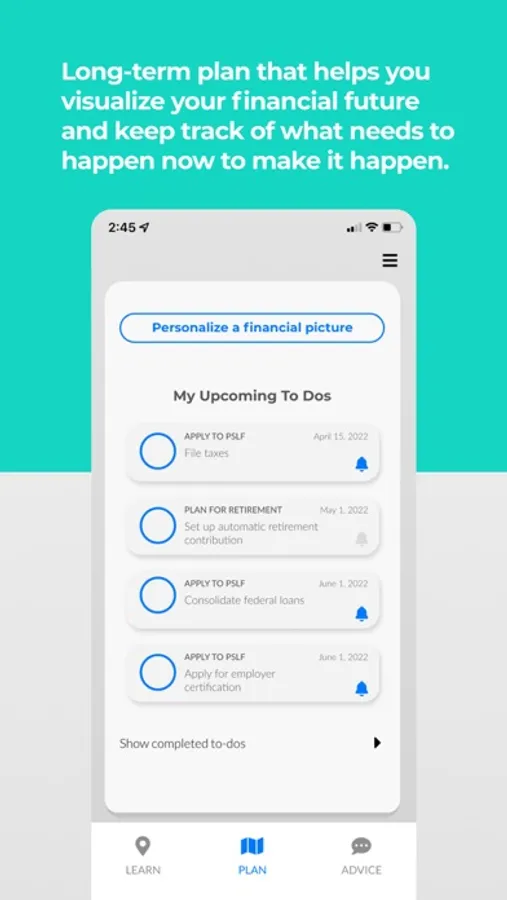 Plan. Your ideal life path looks different from other people’s. As you check off modules on the Learn screen, you’ll answer questions that will trigger notifications and to-dos so you can offload the mental work of remembering what you need to submit and when, for example, when applying for PSLF or consolidating your loans. ScrubMoney will take care of reminding you what you need to do to stay on the path you’ve established as your path to success.