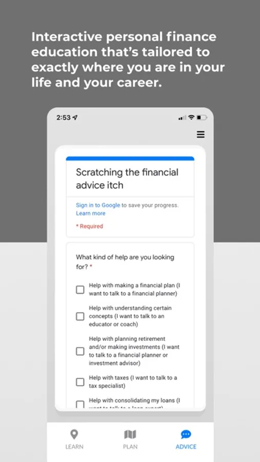 Equip. Learning and planning will be enough for some people. But if you want personalized help — whether you’re looking for investing advice or clarification on compound interest or trying to figure out what you need to do to get a mortgage — you can opt to match with the financial professionals available in Advice.