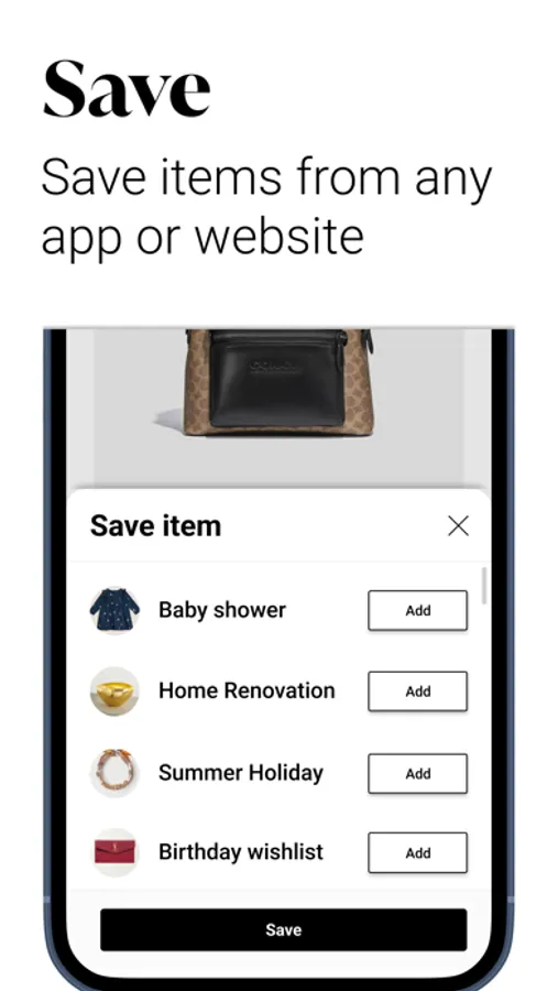 Save items from any app or website. Create as many shoppable collections as you like. Share your collections with a single interactive link. Get price alerts on items you save. Make more considered purchases. Free forever.