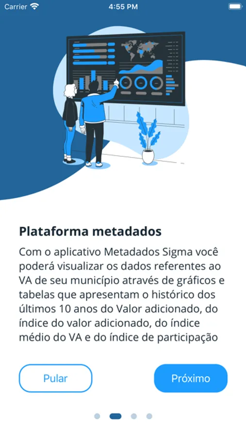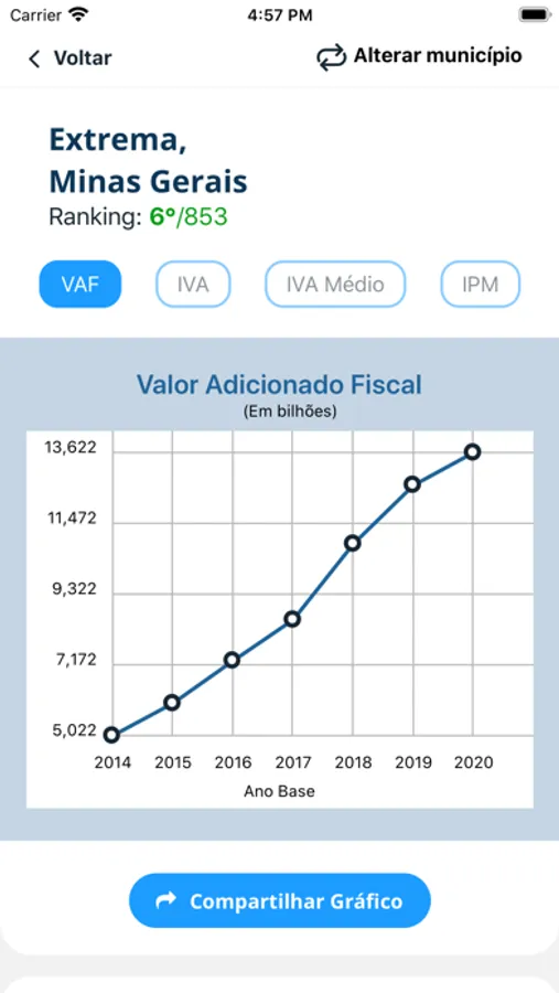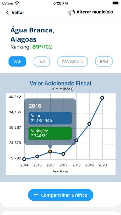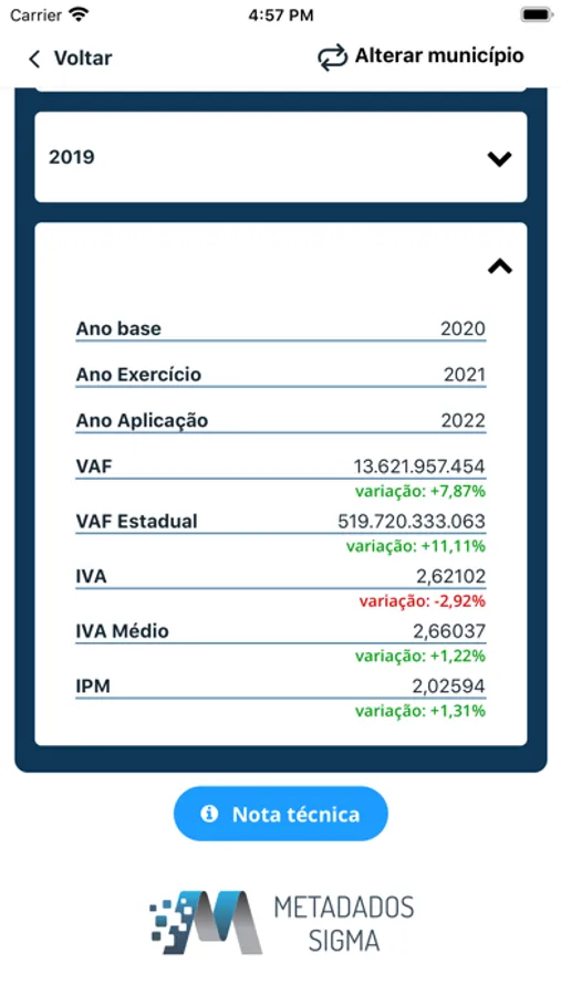 Com o aplicativo Metadados Sigma você poderá visualizar os dados referentes ao VA do seu município através de gráficos e tabelas que apresentam o histórico dos últimos 10 anos do Valor Adicionado, do índice do Valor Adicionado, do índice médio do VA e do índice de participação do município - IPM.