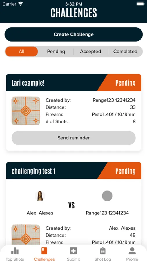 *Challenging friends can be done by selecting a recently scored or shot log target. Any friend with the app can be challenged or a text message code can be sent to friends with out the app to download and compete against you.