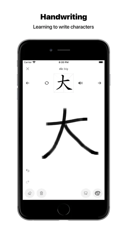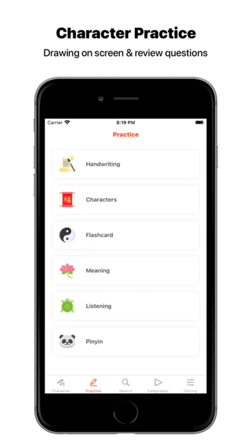 • Character Practice: drawing on screen and answer review questions.