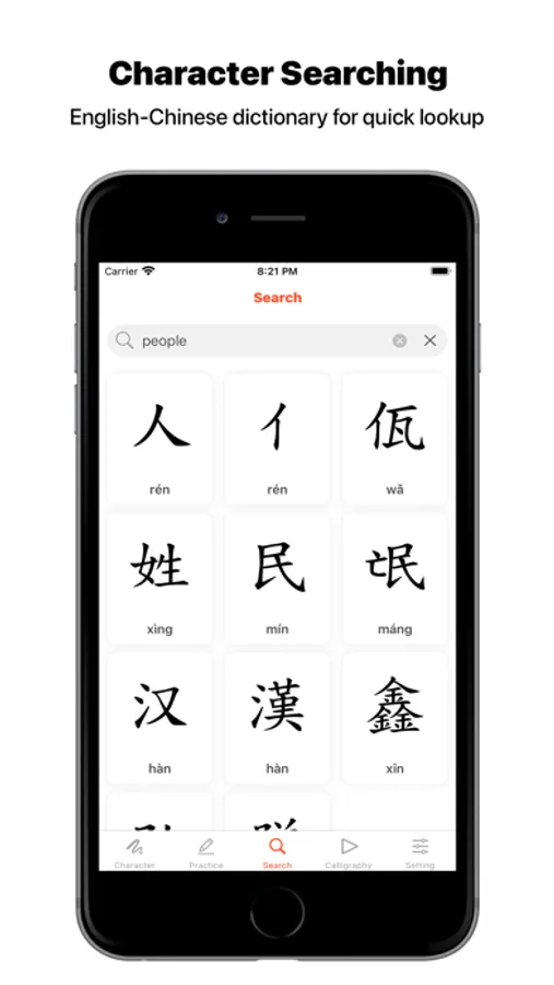 • Character Searching: English-Chinese dictionary for quick lookup.