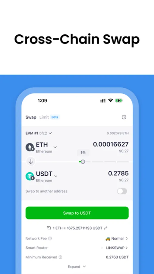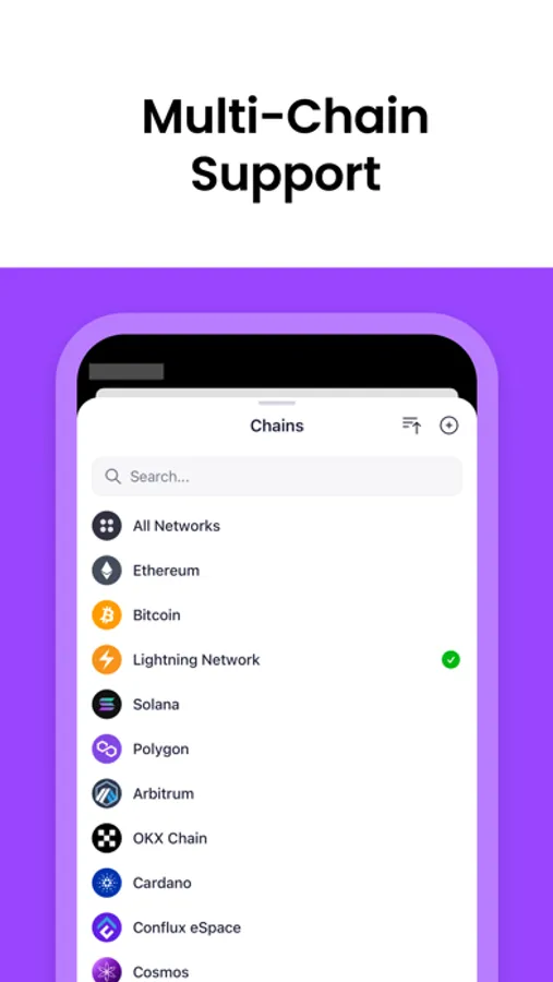 BTC, Lightning Network, Solana, Aptos, Near, STC, DOGE, LTC, Tron, EVM Chains (BSC, ETH, Arbitrum, Avalanche, Optimism, Polygon, CELO, CRO, FTM, HECO, OEC, xDai, and customized EVM Network).
