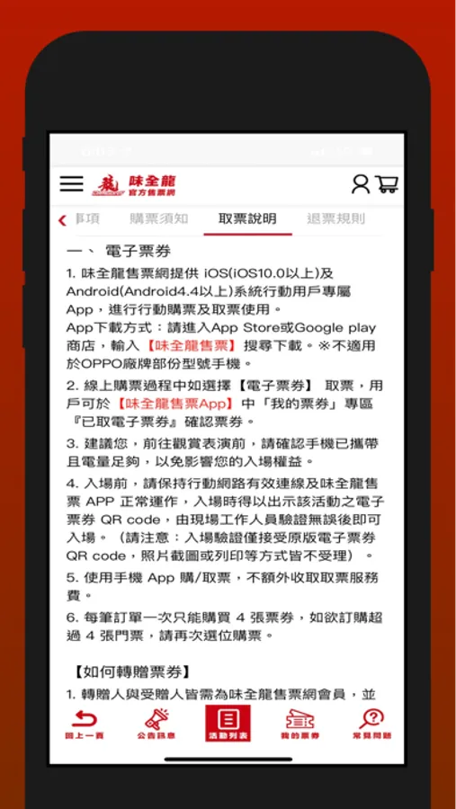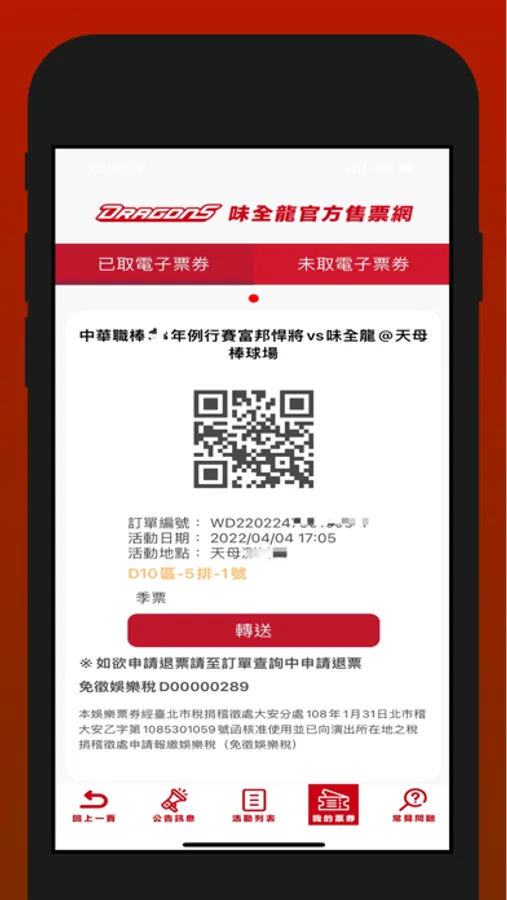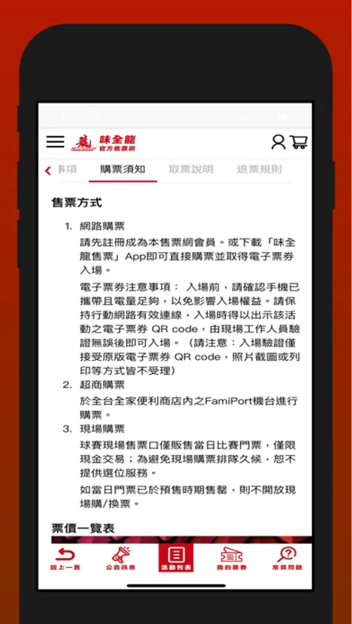 中華職棒味全龍隊官方售票平台,銷售味全龍職業棒球隊主場賽事活動等各項票券,提供球迷朋友更便捷的購票方式,除了將賽事門票導入行動電子化,從購票、取票、轉贈、驗票等全程無紙化,既環保、便利且與時代接軌。