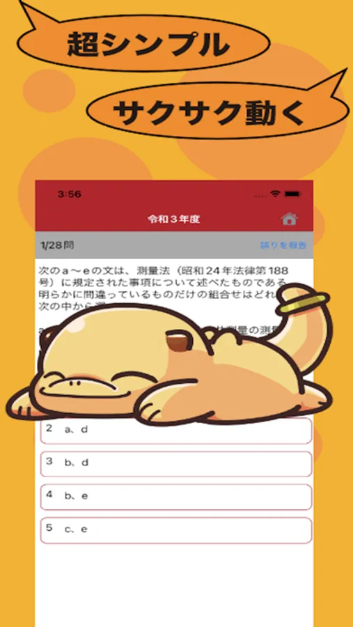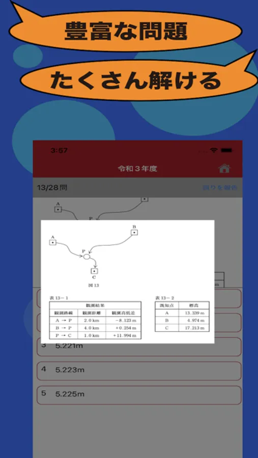 サクサク動きます。 上下のエリアでスクロールでき、問題と選択肢を同時に見られます。また復習機能があり、効率的に勉強できます。 たくさんの問題が解けます。間違えた場合は記録として残り、 文の上部に表示されます。さらに間違えた問題だけをまとめて解ける機能を搭載。復習時はランダムでも解けます。ホームに戻ったとしてもつづきから問題を進められます。解いたあとにバッチリと要復習が下部に表示され、こちらは手動で変更可能なため、たまたま正解したものを要復習に切り替えることができます。反対に、正解したけれど不安な問題は要復習にすることで、あとからの解き直しに便利になります。図は拡大できます。問題を解かなくても次の問題にどんどん進めるため、戻って解き直すことが可能です。問題出典国土地理院HP測量士補過去問からとなります。最適な機能を搭載しており、有効活用できると思います。みなさまの温かいレビューをお待ちしております。