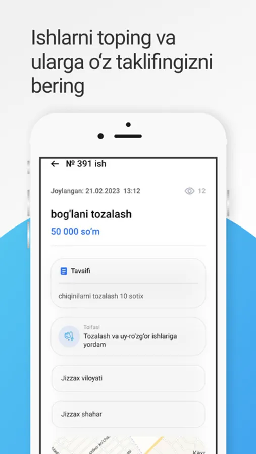 Mobil ilovada foydalanuvchilar turli xil vazifalarni joylaydilar va ijrochilar chop etilgan vazifalarni bajarish uchun o‘z takliflarini berishadi.