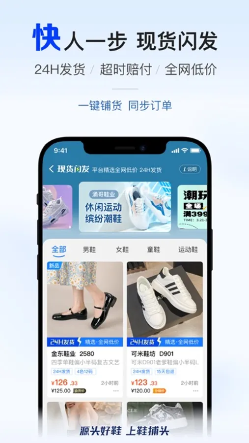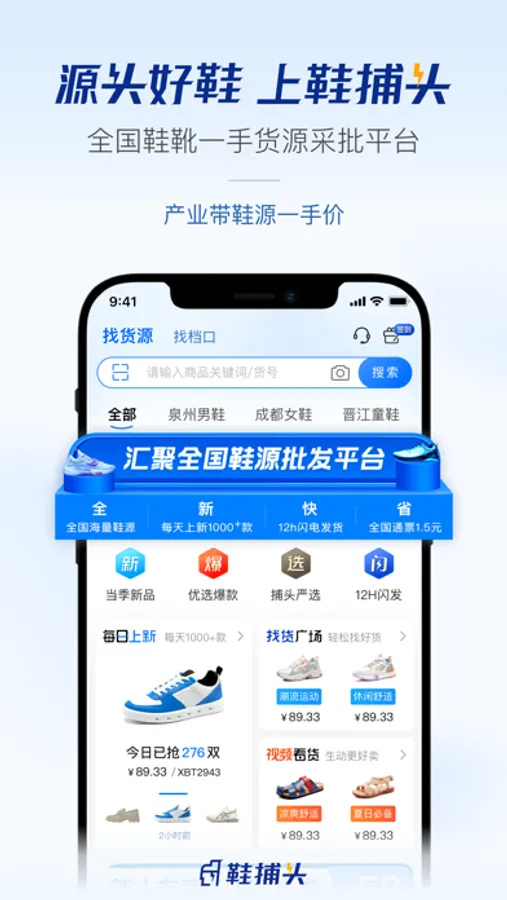 鞋捕头(www.xiebutou.com)平台官方APP,来自全国鞋靴产业带5000+供应商一手货源,一站满足实体、电商、直播、个人多种分销需求,1件无忧代发,7天无忧售后,大数据快速选品,快递费+代发费+质检费仅需1.5元,提供“全、新、快、省”的一站式鞋靴采批服务,提升分销效率,降低采批成本。