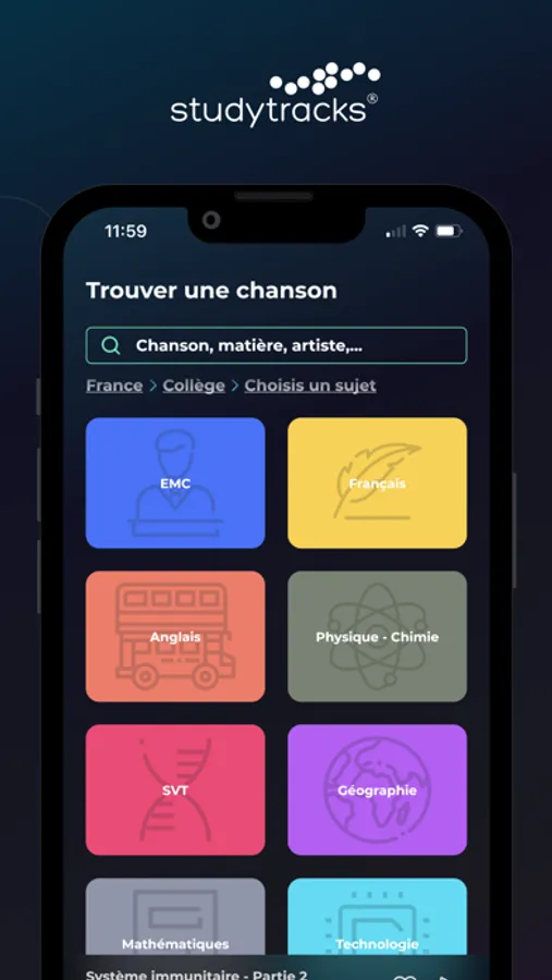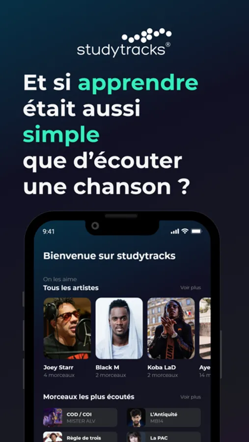 Studytracks est une application permettant d’apprendre en chanson. Vous écoutez une chanson et vous vous souvenez des paroles pendant des années. Sans s’y attendre, les paroles restent ancrées dans votre esprit et vous vous en rappelez instantanément. Studytracks est une méthode pédagogique qui a fait ses preuves. Elle a été développée avec le concours de spécialistes mondiaux des sciences cognitives.