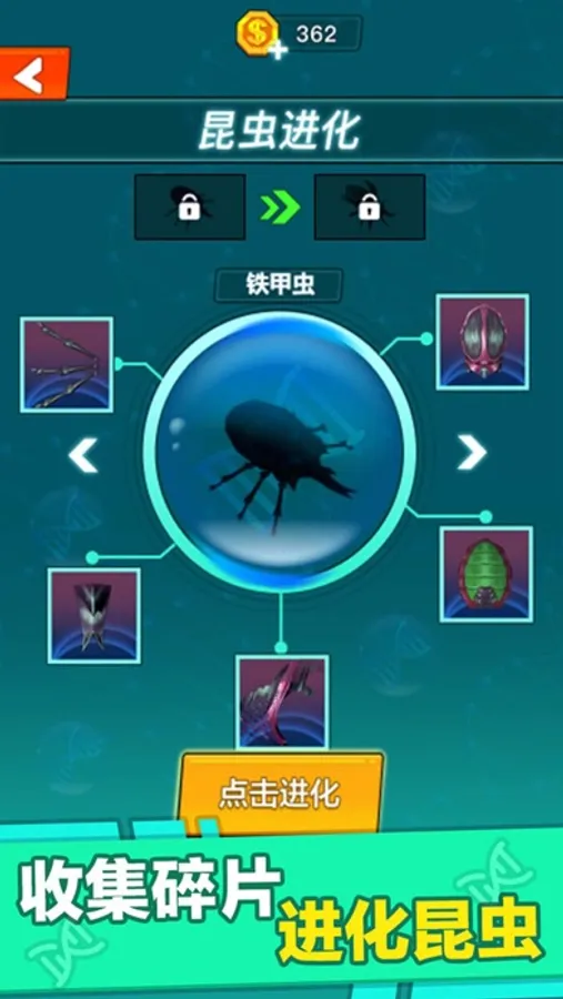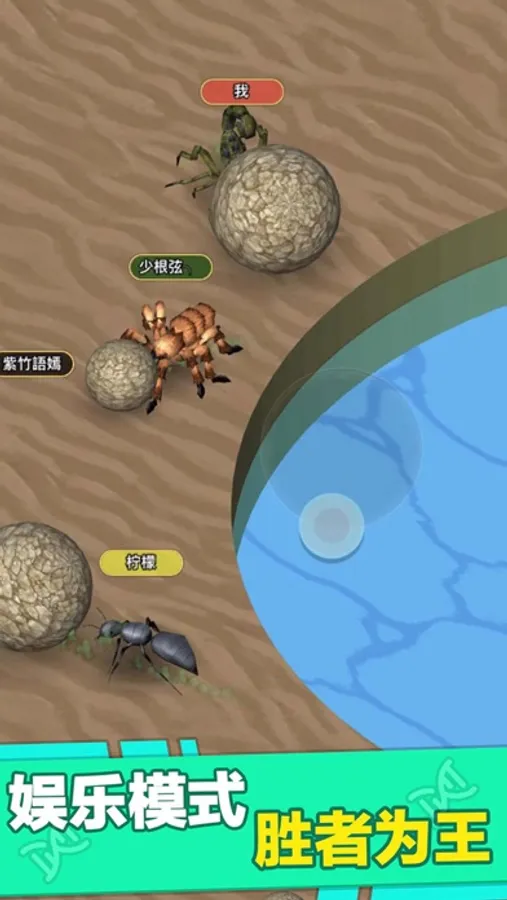 【游戏玩法】通过操作昆虫,击杀其他昆虫,最后生存下来,等级最高者胜利,途中需要不断吃蛋来增加经验,也可以补血,还有躲避高等级昆虫(低等级比较难打赢高等级)以及危险巨物(蛤蟆,蜘蛛)