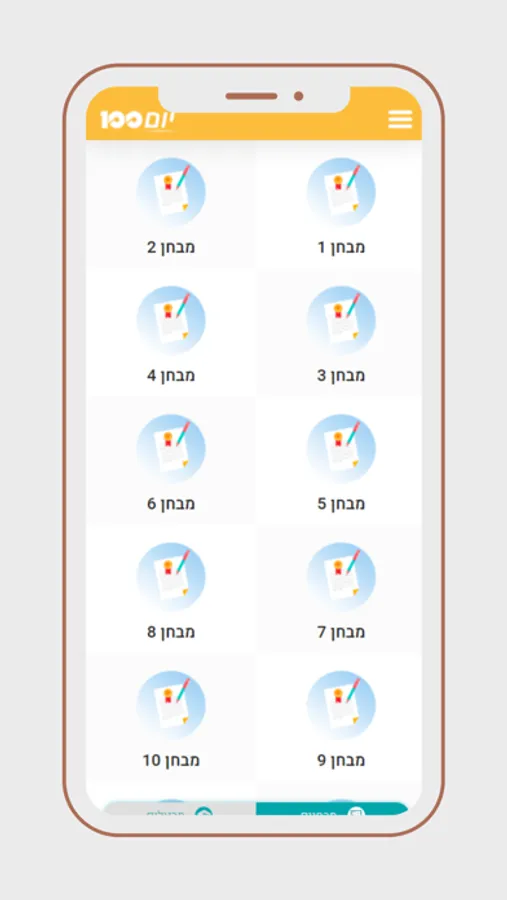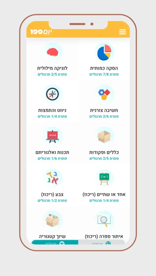 באפליקציית יום100 תוכלו לתרגל את הנושאים השונים שמופיעים במבחנים ביום המא"ה ולבצע מבחנים. התרגולים הם מגוונים בדומה למיונים ביום המא"ה והם כוללים בתוכם: הסקה כמותית, לוגיקה מילולית, חשיבה צורנית, הבנה טכנית, ניווט והתמצאות, פקודות וכללים, תכנות ואלגוריתם, ריכוז, דיוק, מהירות תגובה, אסטרטגיה.