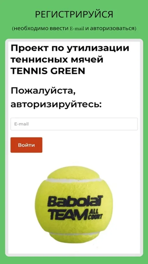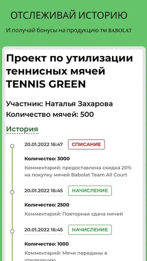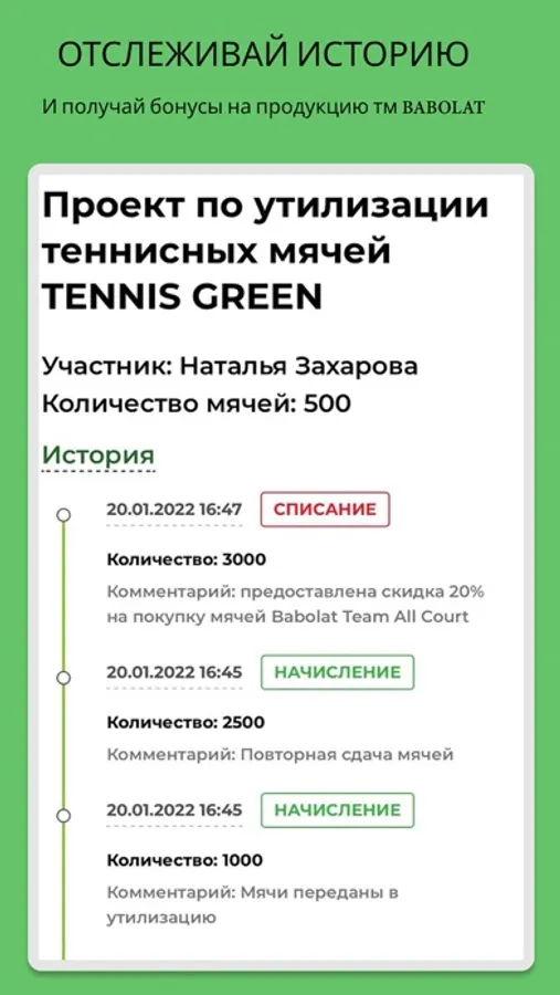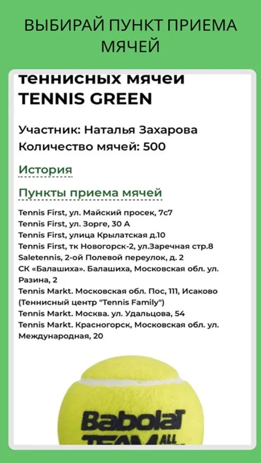 Ежегодно в нашей стране на свалку попадает более 2.000.000 теннисных мячей, а это почти 150 тонн резины и синтетического сукна. Несмотря на всю красоту и величие тенниса, инвентарь и экипировка наносит ощутимый вред окружающей среде. Мы запустили уникальный проект в России по переработке и дальнейшей утилизации использованных мячей - Tennis Green (при участии Babolat). Приложение Tennis Green поможет вам отслеживать историю сбора мячей, адреса пунктов приема мячей, а также накопленные баллы, которые вы можете использовать в качестве скидок на продукцию Tорговой Марки Babolat. Условия акций можно уточнить в магазинах-партнерах программы. Все сданные мячи будут своевременно доставлены в Дмитровский завод РТИ. Резина и сукно будут переработаны и использованы повторно.