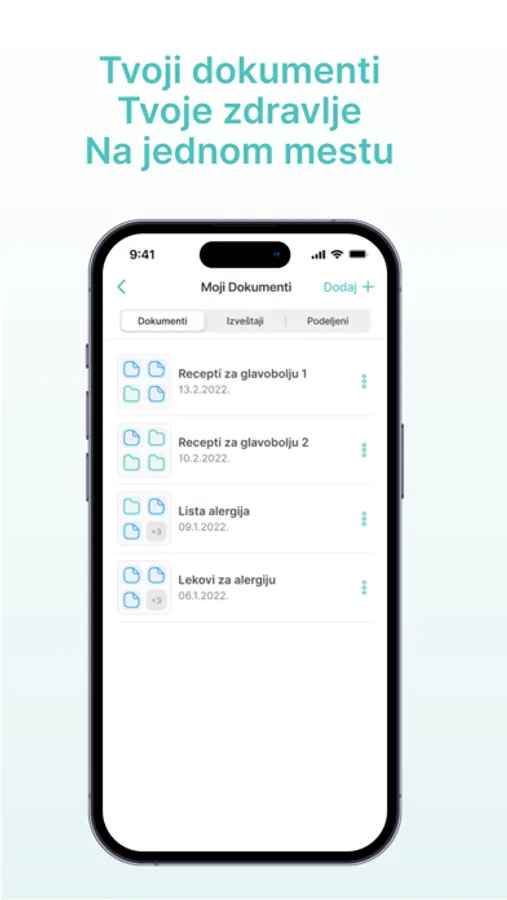 U aplikaciji imate mogućnost čuvanja zdravstvenih kartona (lekarski izveštaji, laboratorijski nalazi, recepti, terapije…) u elektronskom obliku koje se lako dele sa željenim lekarom. Prilikom posete lekaru, lekar šalje svoj izveštaj, recepte ili upute direktno u vašu aplikaciju i njih čuvate u svom telefonu bez mogućnosti da ih izgubite.