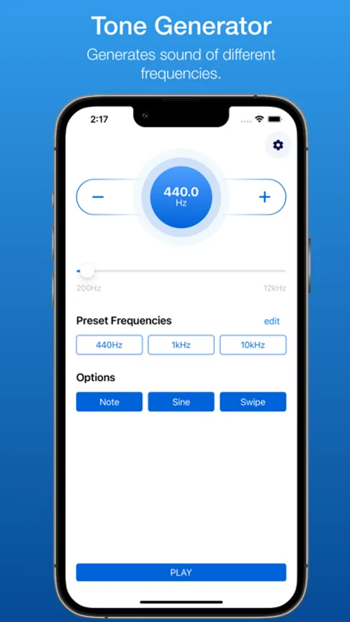 Download Tone Generator for free on your device, utilize the slider to choose the specific frequency, adjust the volume, and hit the Play button.