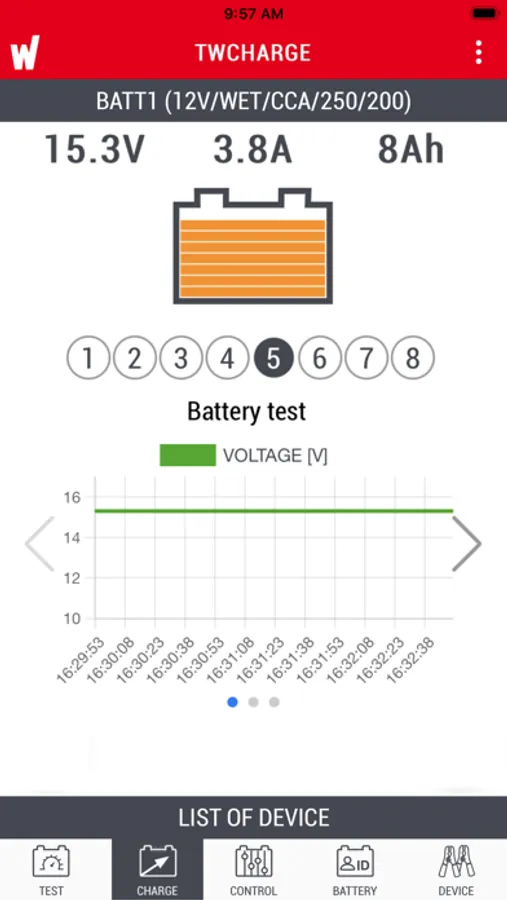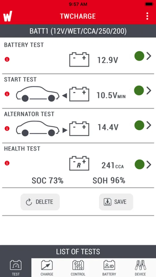 Seleziona un test (andamento tensione batteria; capacità di avviamento; alternatore del veicolo; stato di carica e di salute della batteria), avvialo e visualizza in modo semplice e chiaro i risultati. I report dei test possono essere condivisi, salvati e archiviati.