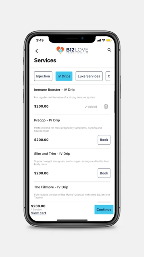 - View service menu: Vitamin Injections, IV Vitamin Drips, etc.