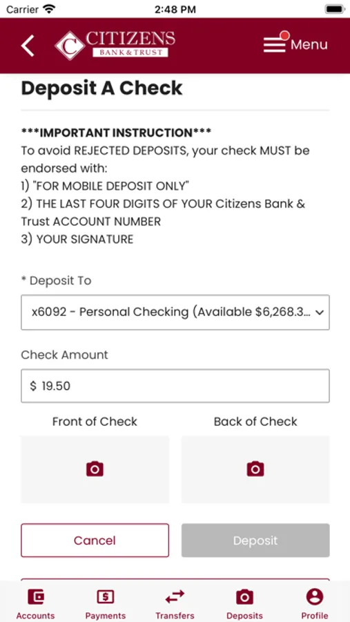 Submit check deposits using your device’s camera.