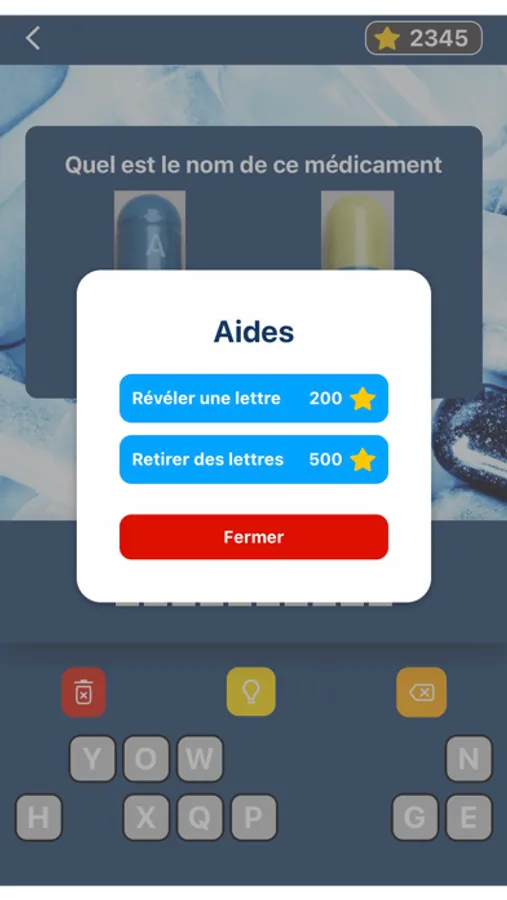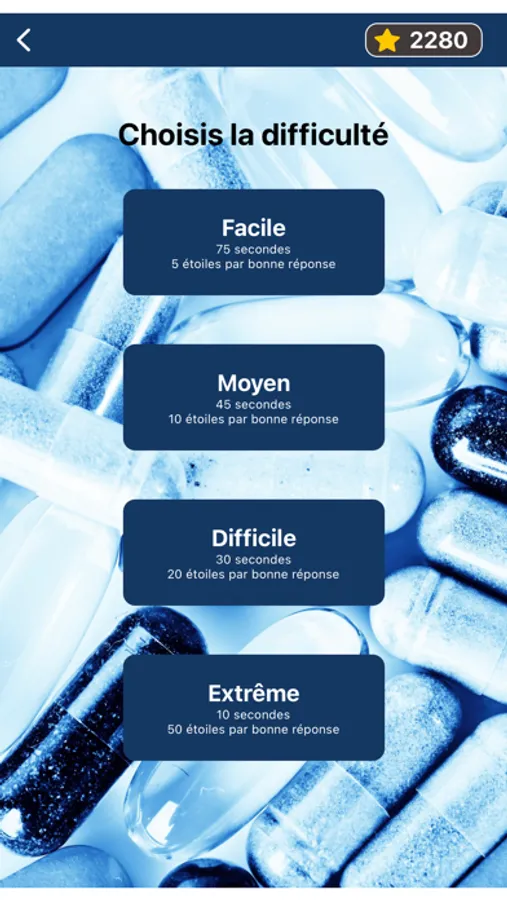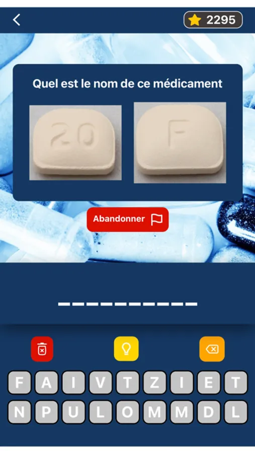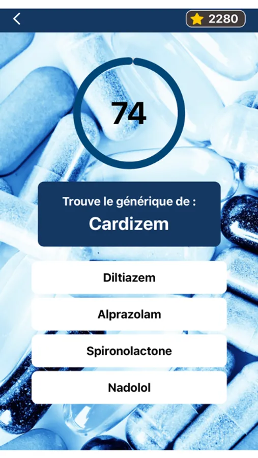 Ce jeu aide la mémorisation des différents noms de médicaments et de leurs génériques et à reconnaître différents comprimés. Il est composé de 2 modes. Dans le premier mode (trouve le générique), il y’a 4 niveaux de difficulté. On nous donne le nom du médicament original et il faudra trouver son générique avant que le temps s’écoule. Dans le deuxième mode (2images, 1 mot), on nous présente des images de médicaments et nous devrons deviner le nom du médicament.