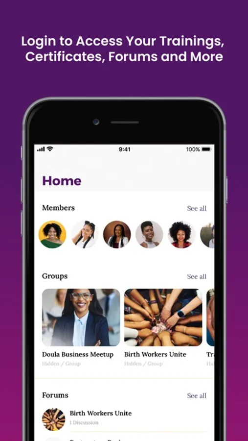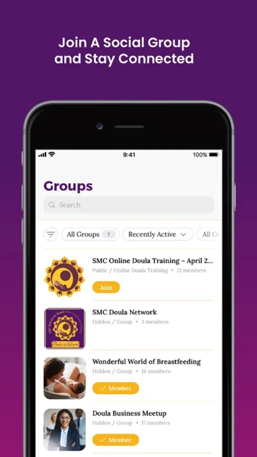 Social Groups & Discussions: Participate in active discussions on topics relevant to the doula profession and business growth. Create and join social groups to share knowledge and learn from your peers.