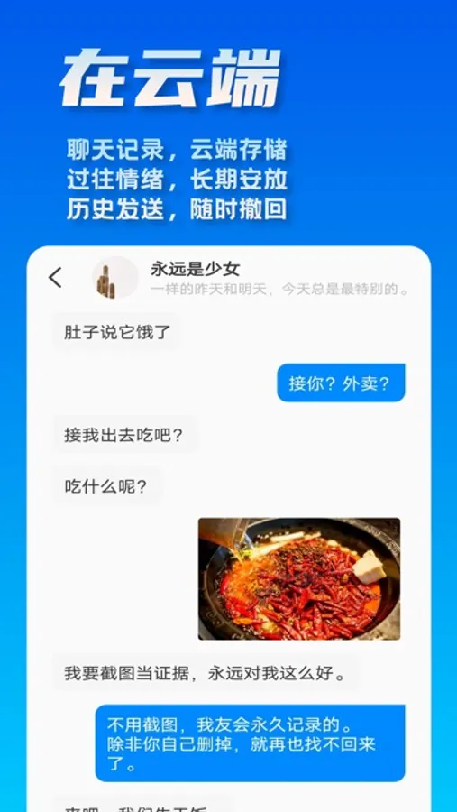 【云数据中心】一切基于云的通信聊天,云端同步您的聊天数据,让对话成为一种日记。过往发送无限期删除/撤回。