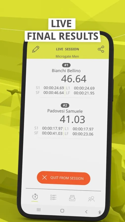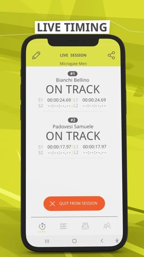 As soon as a timing session starts, I can share a session identification code with “Guest” Users. A User who has installed the HiTiming app and receives a text message or an email with the “Session ID” will launch the App in Guest mode and receive all the remote session data in real time. Once the session is closed by the primary user connected to the stopwatch, the sessions on the remote devices will also be closed automatically. Closed sessions will be available in the Session Archive.