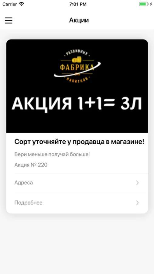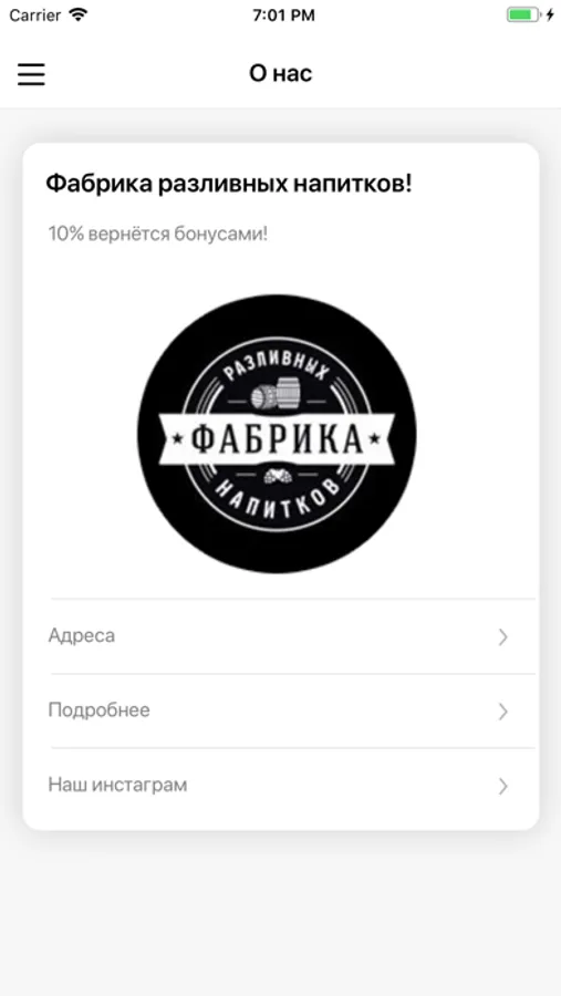 Реализовано брендом “Фабрика разливных напитков”, специально для своих почитателей и клиентов, современного сервиса обслуживания, и конечно же любителей бонусов и скидок в нужное время, в нужном месте!