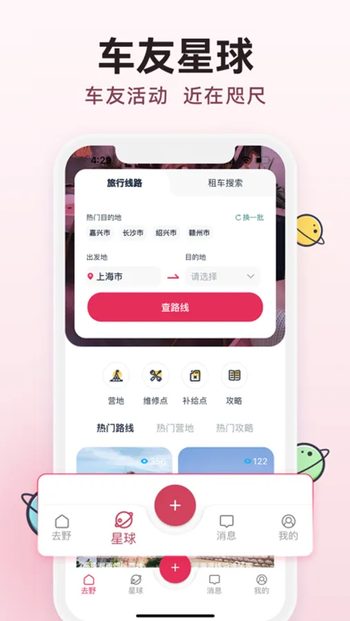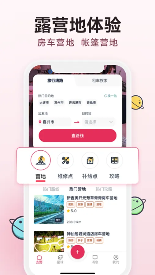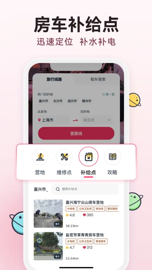 为广大的房车用户和旅行者提供营地搜索、预定、线路规划、维修点、补给点、停车点查询、攻略等“一站式”服务