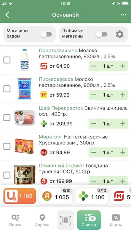 Приложение позволяет сравнить конечную цену за весь список покупок в разных магазинах.