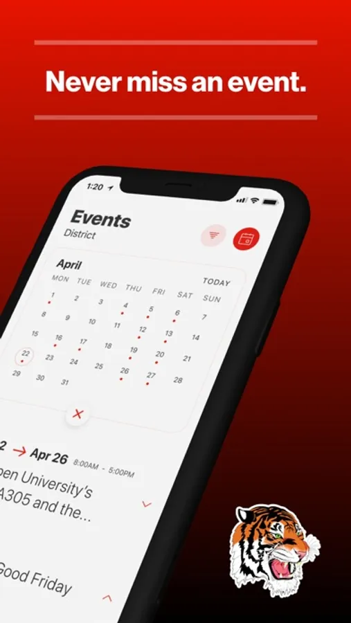 The event section shows a list of events throughout the district. Users can add an event to their calendar to share the event with friends and family with one tap.
