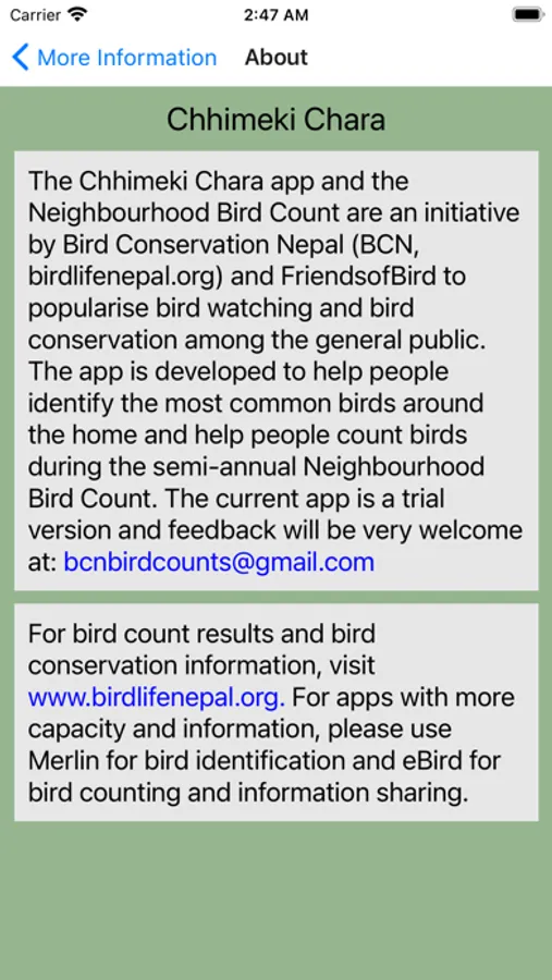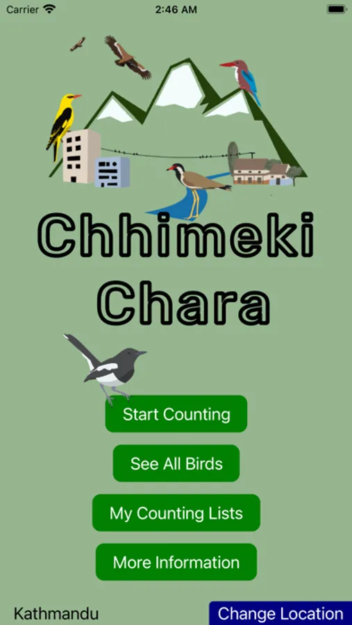 The app is for enthusiastic, occasional as well as one-time bird watchers. It focuses on only 100 birds to avoid that beginners get drowned in complexity and too many names. If you want more details and also birds that occur farther away from the human environment, you can always consider the more elaborate Merlin and eBird apps, although eBird doesn’t work yet for the Nepal Neighbourhood Bird Counts.