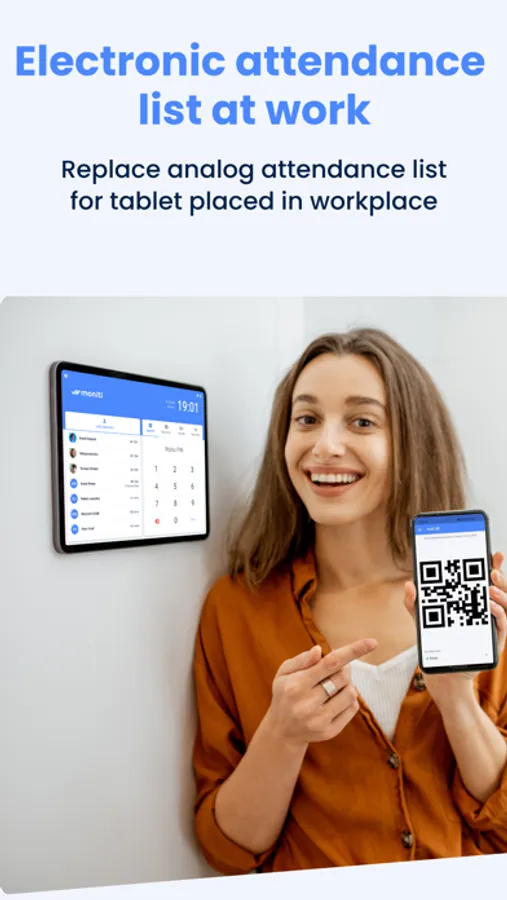 Employees who do not have access to a phone or computer during work will find it best to use the Moniti Kiosk application, which you can install on your tablet and use to replace the paper attendance list in your company.