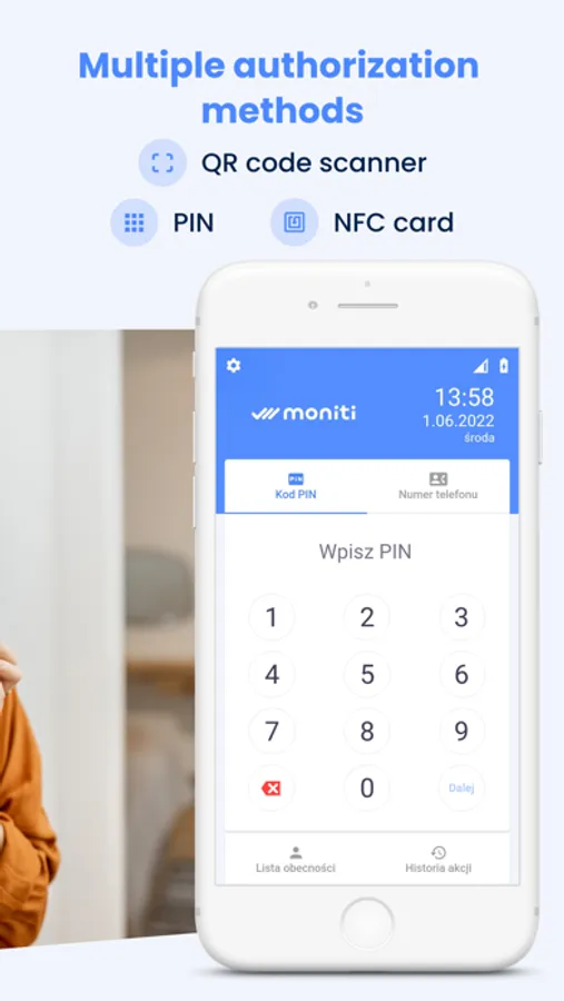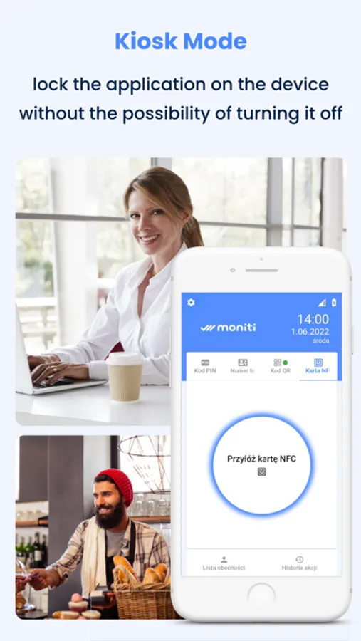 With the Moniki Kiosk app you can turn any tablet or phone into an electronic attendance list. You will install it in your company, thus replacing the paper timesheets tracking of your employees. Your employees will track their working time using a given PIN code, printed QR codes or NFC (contactless) cards.