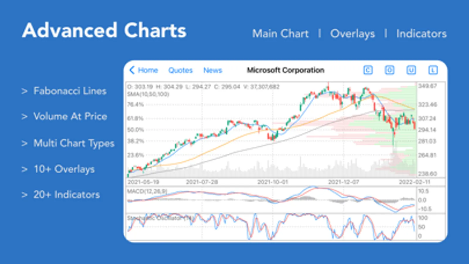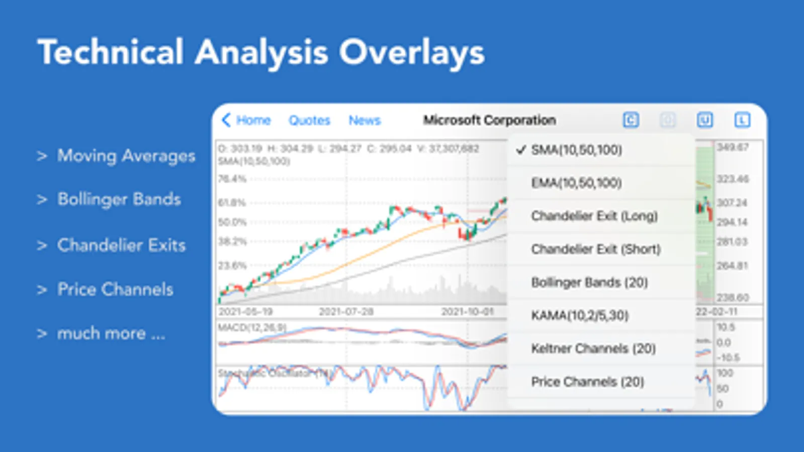 3. 10+ Stock analysis overlays: Bollinger Bands, Chandelier Exits, Moving Averages, Keltner Channels, Price Channels, Support and Resistance lines, and much more ...