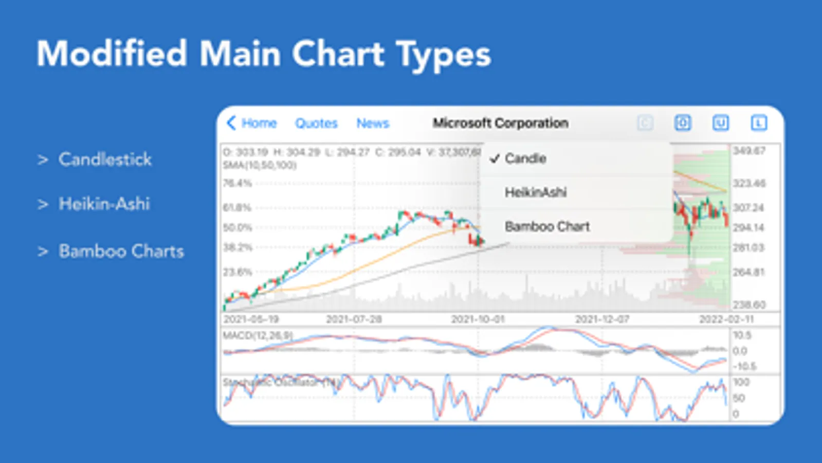 2. Main Charts: three types, Candlestick Charts, Heikin-Ashi Charts and Bamboo Charts.