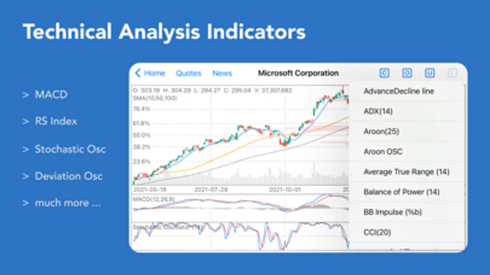 4. 20+ Technical analysis indicators: Accumulation Distribution Line, Aroon Up and Down , Aroon Oscillator , Average Directional Index (ADX), Average True Range (ATR) , Commodity Channel Index (CCI), Chaikin Money Flow (CMF), Chaikin Oscillator, Coppock Curve, Full Stochastics, MACD, Mass Index, Money Flow (MFI), On Balance Volume (OBV), %B Indicator, Rate of Change (ROC), Relative Strength Index (RSI), Deviation Oscillator, Sigma Oscillator, Williams %R (%R), and much more ...