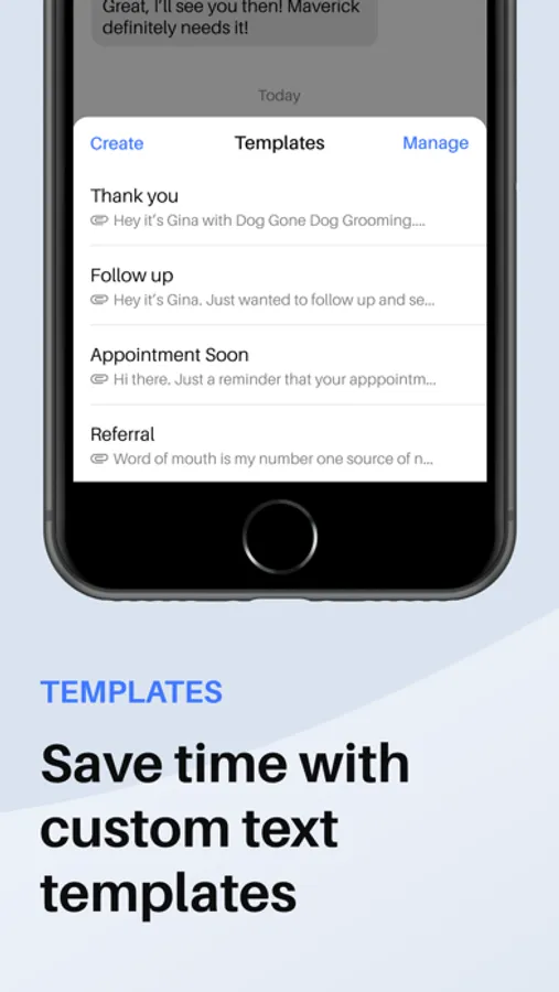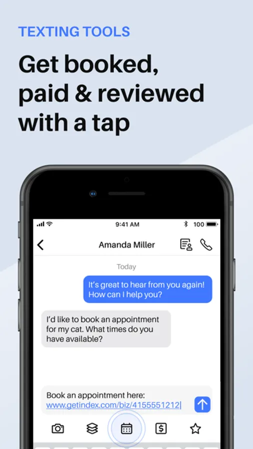 Access shortcuts for interacting with customers right from your text thread using Index’s Texting Toolbar. Create reusable templates for common questions, book appointments, request payment, collect reviews, and more—all with a tap.