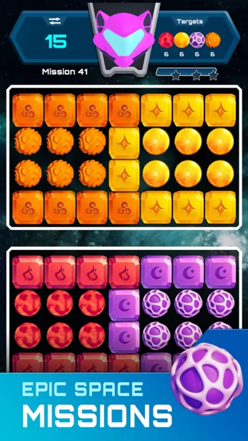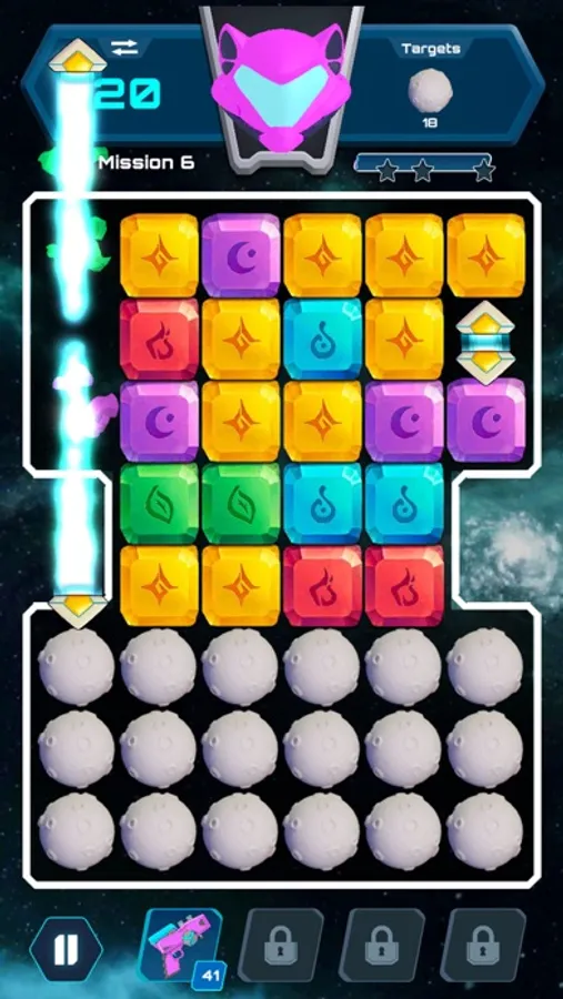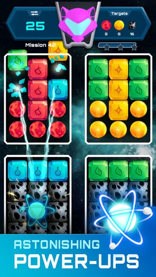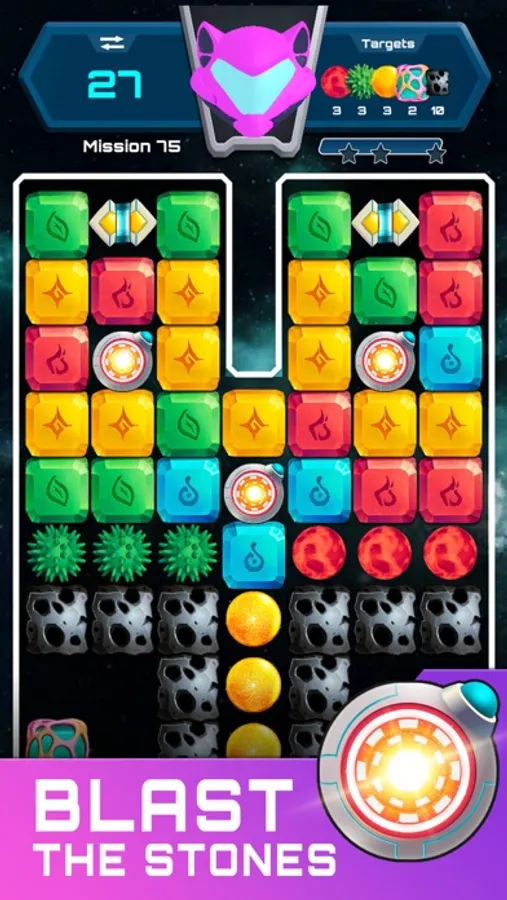 How to play: Each level/mission has unique targets found on the top right of the screen. Blast like-colored stones in groups of 2 or more to progress towards each level’s targets. Note that the top left will show you how many moves you have remaining to reach the desired target. Combining groups of like-colored stones of 5 or more will create power-ups to assist you in your missing. Use a combination of power-ups created in game or unlocked at the bottom of the screen to help you complete each mission.