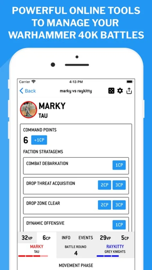 Automatically gain your CP at the start of your turn, check how many CP you have, see the specific stratagems available to you for the current phase, and simply click a button to activate them and spend your CP.