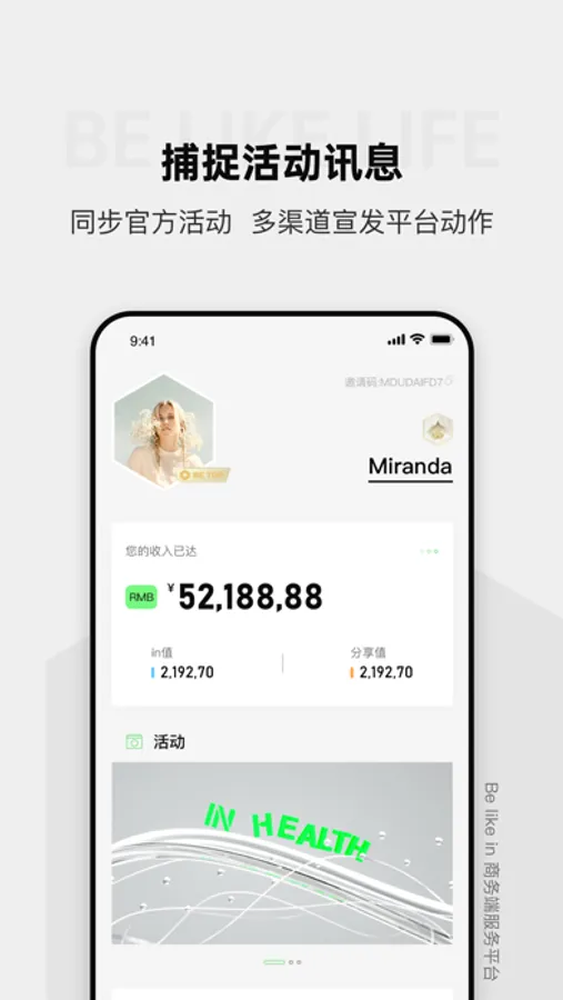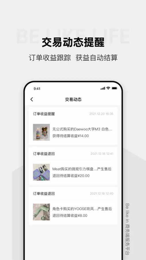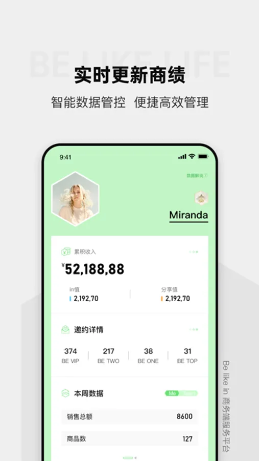 Be like in全国经销商服务端平台Be like life,全面展示用户收益、积分、邀约、订单等详细,提供智能便捷化客户管理服务,并同步获悉平台新品及活动讯息,实现全网销售连接、交易转换、驱动客户等功效,让用户业务在线化、数字化、简单化,效率提升,获得轻松满意的一站式商务管理服务。