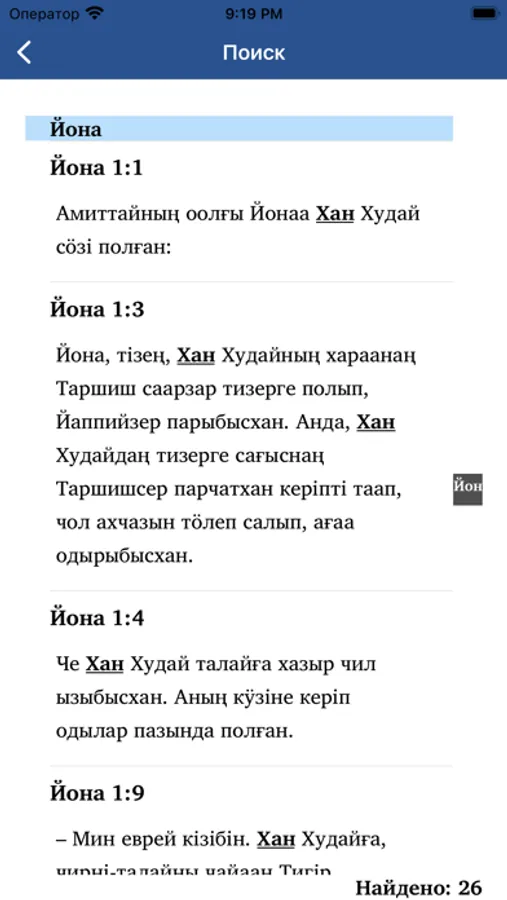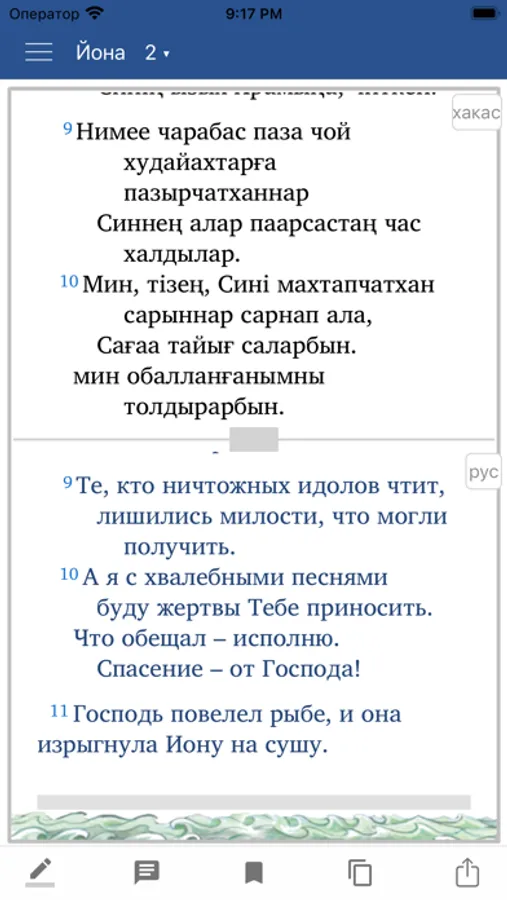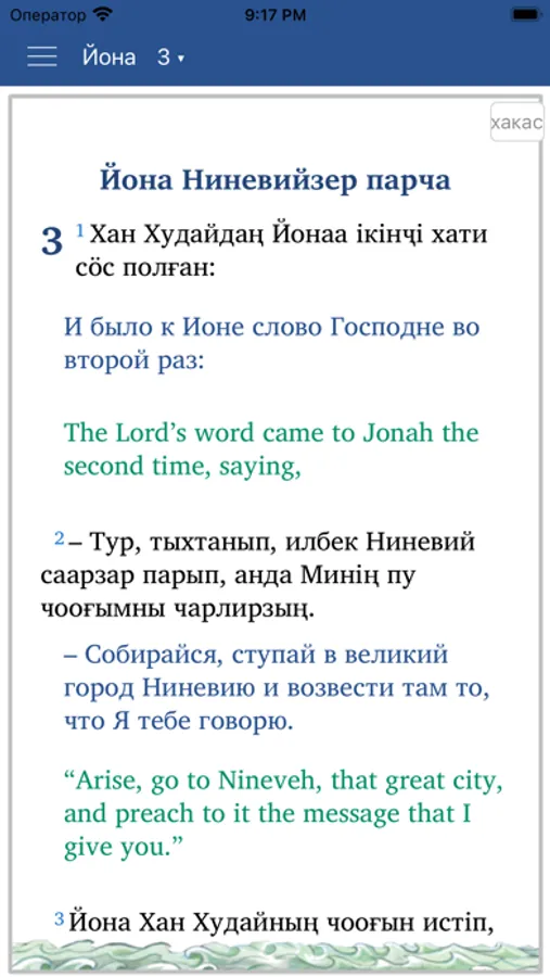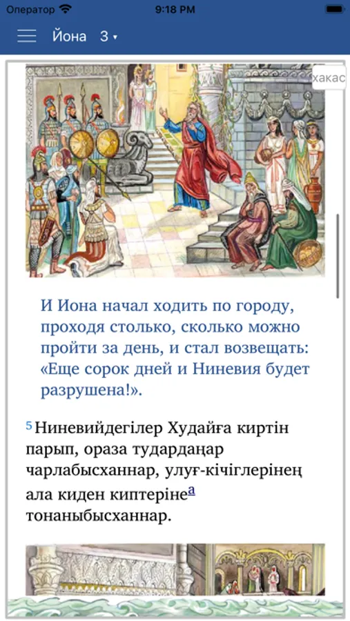 The illustrated Jonah app in Khakas for children and adults. This Scripture app facilitates Bible study in the Khakas language. The Russian (NRT) and English (WEB) translations can optionally be added in parallel to the Khakas text, or they can be viewed in verse by verse mode. Users can highlight verses in different colors, make bookmarks, write notes and view their reading history.