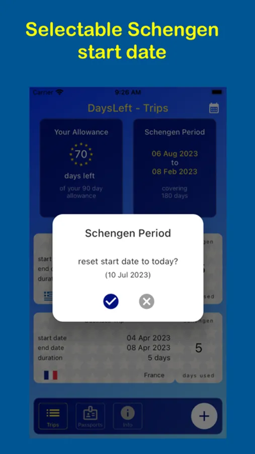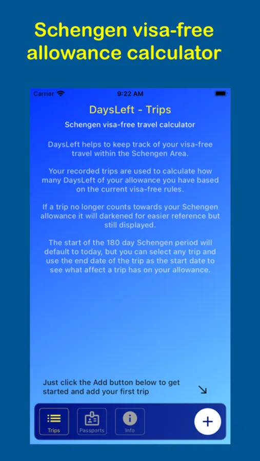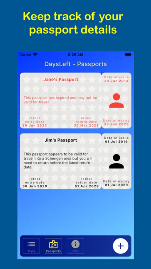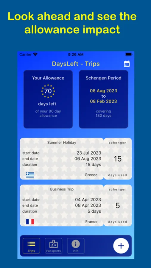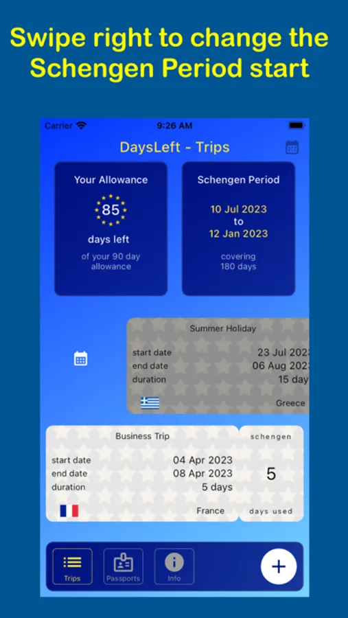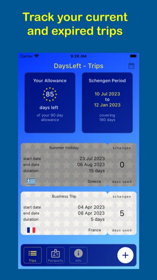 DaysLeft allows you to track and record the trips you make into the Schengen area so that you can monitor how many days of your free allowance you have left. It will show you the number of days left that you have based on the trip information that you add. It also allows you to record passport information and check when and if the passport dates are valid for travel.