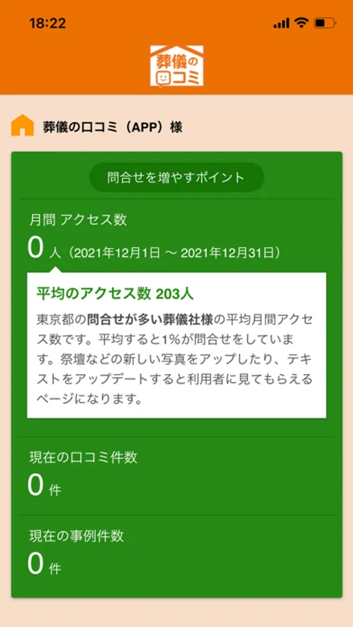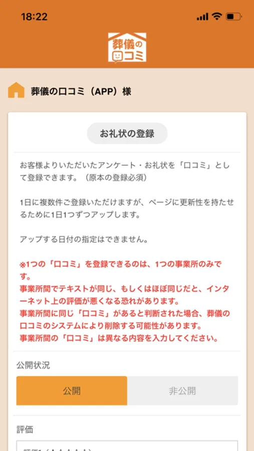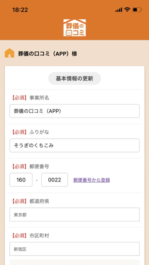 葬儀の口コミサイト「葬儀の口コミ」の葬儀社様専用編集画面です。特徴や写真、お礼状などの入力がアプリより可能です。