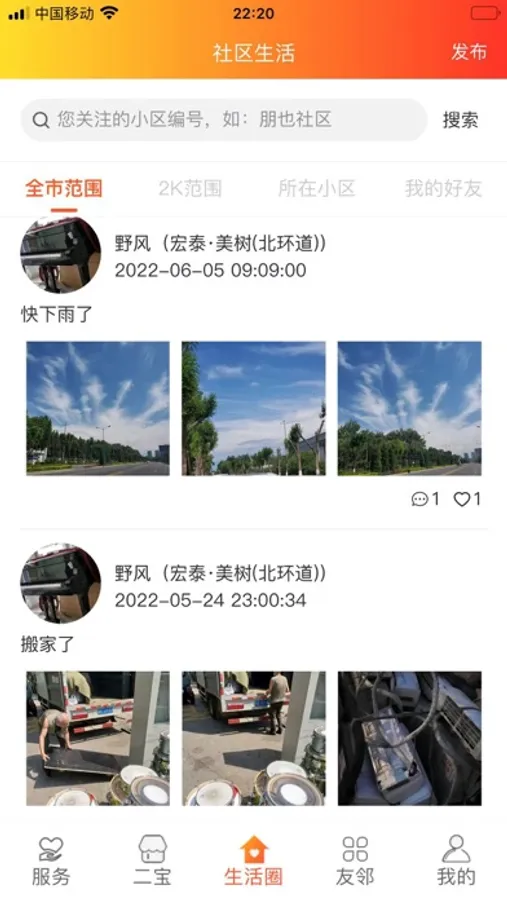 1. 用户可以发布社区动态,关注友邻发布的社区动态。