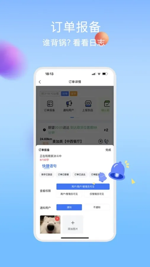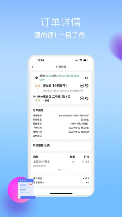 配送员可以在 该APP方便的接收配送订单、管理订单信息、查看统计数 据等。