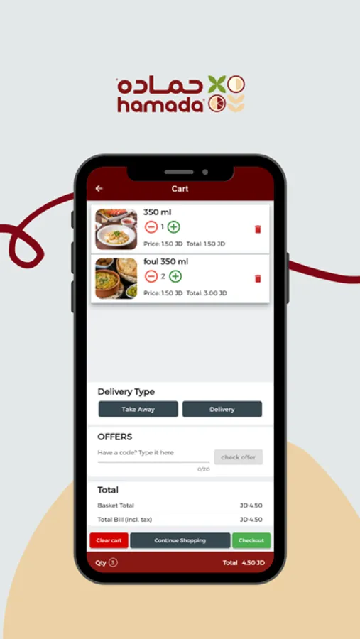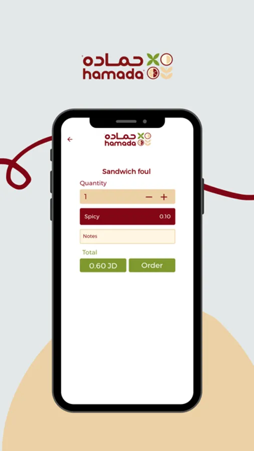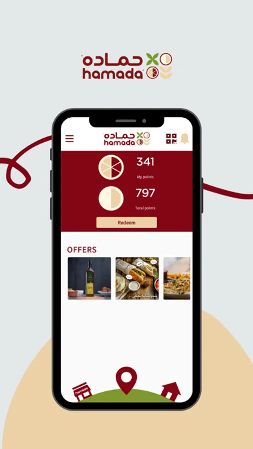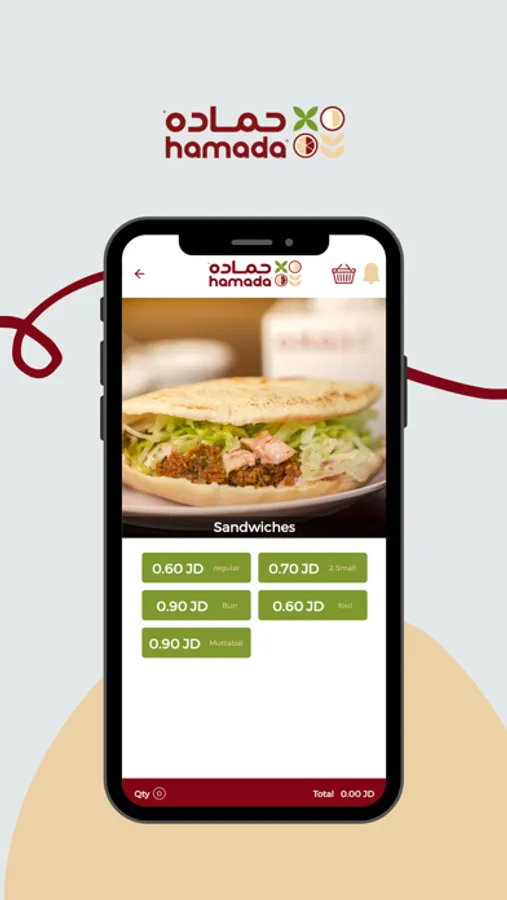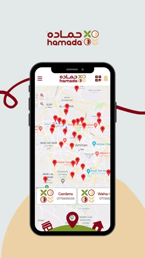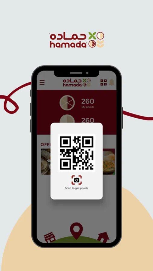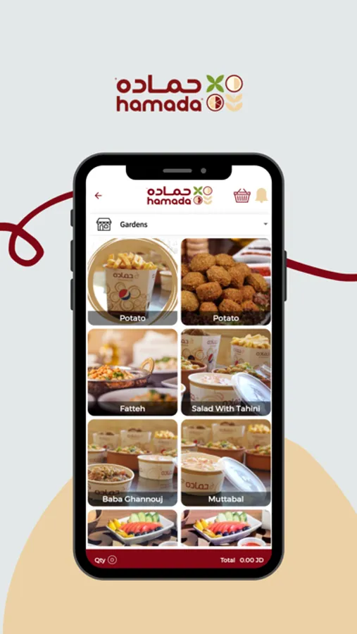تطبيق حماده يعرض العديد من الاطعمه التي يقدمها المطعم مثل الحمص والفلافل والفته حيث يمكن المتسخدم من الطلب من خلاله ويتيح امكانيه التوصيل او والاستلام من المطعم ويمكن من خلال التطبيق قراءة الكود الخاص بحماده لاستبدالها بالجوائز القيمه