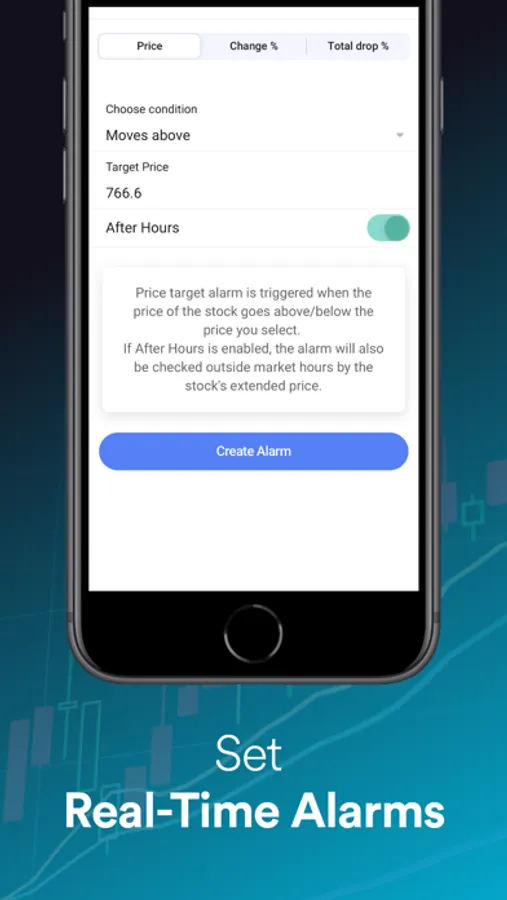 - After hours alerts. You can set alerts for after hours prices and get notified on the price change.