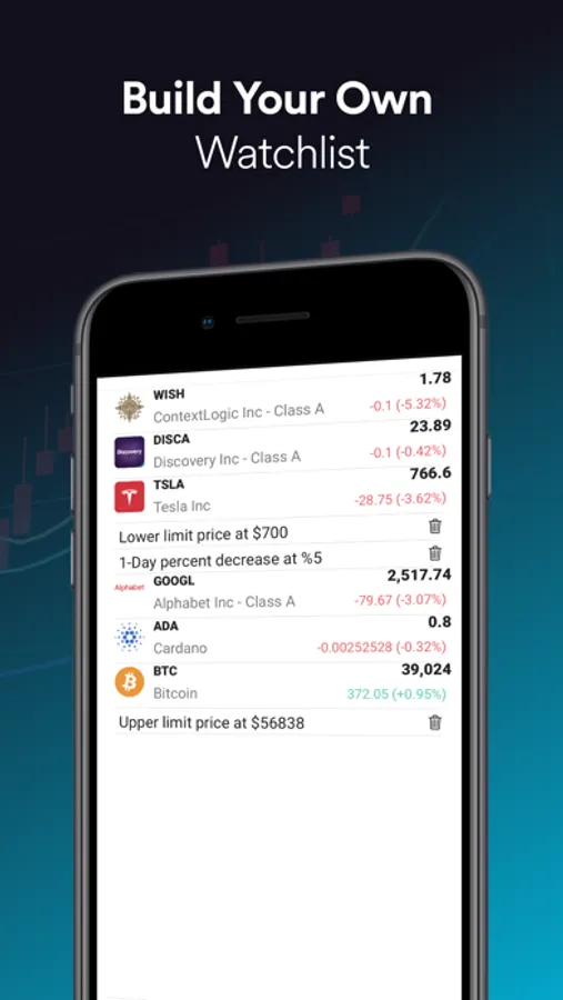 - Build your own watchlist. Select your favorite stocks and track their price movement at a glance.