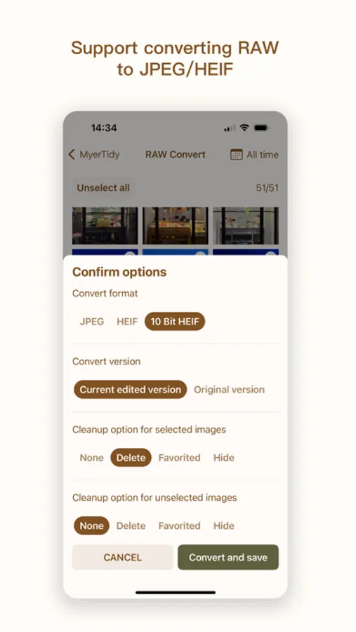 - Convert raw photos to HEIF/JPEG. You can convert your raw photos to HEIF/JPEG and choose to delete the original photos. Also, you can choose to preserve HDR effect.