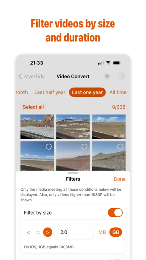 - Convert 4K videos to 1080P, while preserving Dolby Vision HDR. You can filter videos by their creation date, duration or file size to convert. This will help you save a lot of storage space.